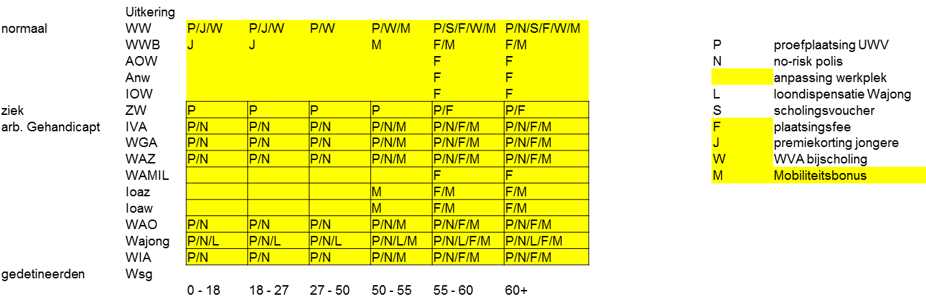 Het huidige systeem is als een bedrijf met een waterhoofd. Er worden door de overheid jaarlijks enorme kosten gemaakt om de uitkeringen betaalbaar te stellen. Neem de WWB, € 6 miljard om uit te keren en een veelvoud aan uitvoeringskosten. In totaal zijn er 17 verschillende uitkeringsvormen met daaronder 24 verschillende regelingen en dikwijls conflicterende voorwaarden en verplichtingen. Zie onderstaand tabel. Landelijk zijn er nog 274 (!!!) aanvullende gemeentelijke sociale potjes. (Praktijkvoorbeeld; een gedeeltelijk arbeidsgehandicapte weduwnaar die vroeger in het leger gediend heeft, is afhankelijk van 4 verschillende uitkeringen, en moet voor de laatste € 80,- per maand voor het sociaal minimum inkomen naar de WWB. Dit houdt in dat hij jaarlijks 4 verschillende aanvragen moet bijhouden, met enorme foutgevoeligheid in de aanvraagprocedure en kosten makend voor 4 verschillende sociale instanties.)