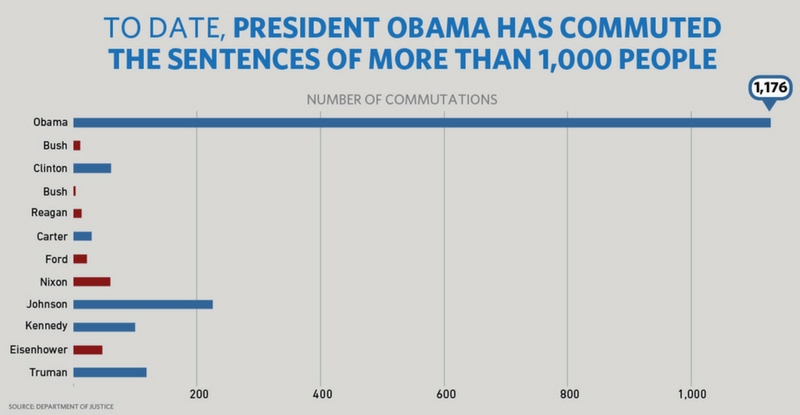Obama heeft tot nu toe de veroordeling van de 1324 mensen omgezet, waaronder 395 levenslange gevangenisstraffen, en een totaal van 148 gevallen, volledige gratie verleend.