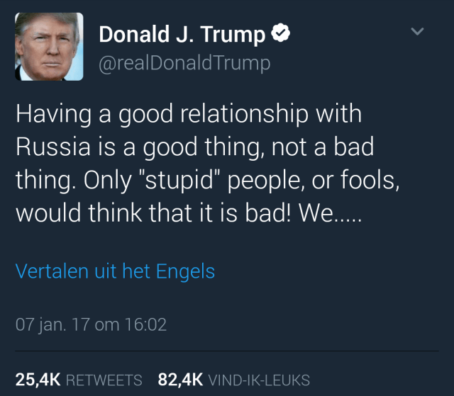 “Having a good relationship with Russia is a good thing, not a bad thing”, verklaarde hij vanuit zijn Trump Tower, om eraan toe te voegen: “We have enough problems without yet another one.”