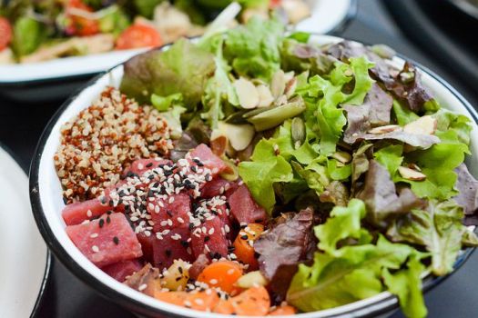 Lekker quinoaspinaziebosbespompoenpittensalade eten op de redactie