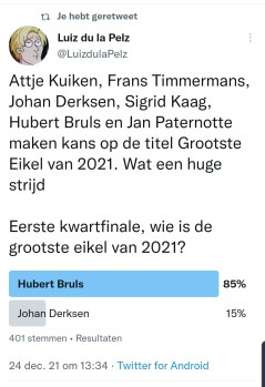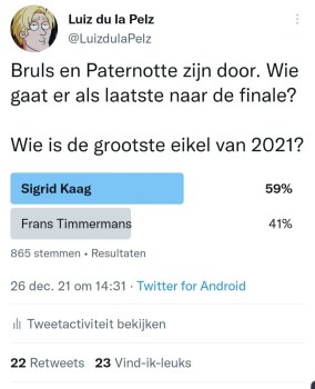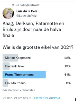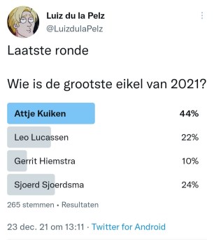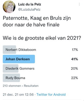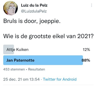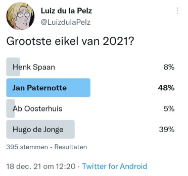 Wat hebben Attje Kuiken, Leo Lucassen, Gerrit Hiemstra, Sjoerd Sjoerdsma, Marion Koopmans, Diederik Jekel, Frans Timmerans, Erik Mouthaan, Norbert Dikkeboom, Johan Derksen, Diederik Gommers, Rudy Bouma, Ernst Kuipers, Mark Rutte, Sigrid Kaag, Thomas van Groningen, Hubert Bruls, Wouter de Winther, Jaap van Dissel, Sander Schimmelpenninck, Henk Spaan, Jan Paternotte, Ab Osterhaus en Hugo de Jonge met elkaar gemeen? Ze pikken allemaal de laatste bitterbal van het schaaltje. Zo zijn deze mensen. Daarom hebben we even een Twitter-competitie gemaakt (soort This is the Shithole of Holland, maar dan kleiner) en Twitterend Nederland de Grootste Eikel van 2021 laten kiezen. En wat een succes zeg. Wat een ongekend succes. Niet normaal. Er zijn in totaal 5134 stemmen uitgebracht. Dat is meer dan het EenVandaag Opiniepanel, alleen wij komen er niet mee op tv. Vraag je eens af hoe dat komt. Wij feliciteren in ieder geval Jan Paternotte van harte met de titel Grootste Eikel van 2021. Jan maakte in de eerste ronde gehakt van Henk Spaan, Hugo de Jonge en Ab Osterhaus en in de halve finale van Attje Kuiken, om in de finale kopstukken als Bruls en Kaag ruimschoots te verslaan. Jan is oprecht een eikel.
