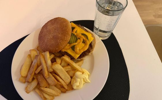 De chef kiest voor een verticale opbouw waarin vlees en kaas elkaar ontmoeten in een warme omhelzing van smaak. De jalapeño fungeert als narratief twistpunt, terwijl de patat een rustiek contrapunt biedt aan de burgerarchitectuur. De mayonaise wordt gepresenteerd als een witte stilte naast het geheel. Het glas bruiswater reflecteert het licht van de middag en herinnert ons eraan dat zelfs de meest robuuste maaltijd baat heeft bij nuance.
