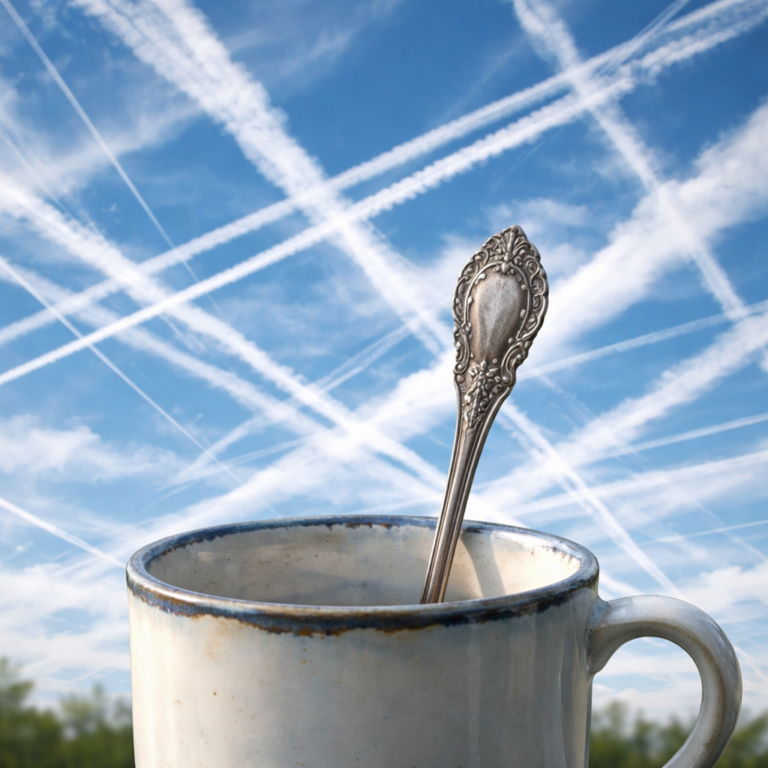 Een felle witte streep trok een rechte lijn door de avondlucht. Carla keek ernaar vanaf haar oude versleten bank alsof ze getuige was van een waarschuwing die alleen voor haar bedoeld was. “Ze denken dat we niets doorhebben,” fluisterde ze, terwijl ze haar telefoon ontgrendelde. ‘SkyWatcher_Anja en 112 anderen hebben je bericht geliket.’ Haar linkerhand speelde met het antieke zilveren lepeltje in haar mok met kruidenthee en honing. Likes op social media waren haar brandstof. Het bewijs dat ze niet alleen stond in haar strijd.